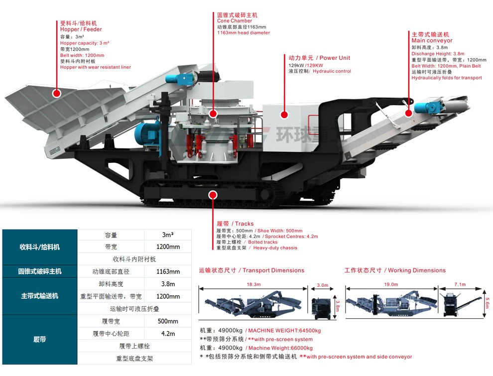 HC配置有HC300圓錐破碎主機,靜液壓直接驅動通過液壓調節(jié)排料口大小,受料斗/給料機帶有全白動,破金屬探測系統和卸料系統,起到保護破碎主機的作用,并且減少了因通過卸料槽人工清除金屬物而造成的停機時間。此外該設備還具有安裝迅速,檢修簡易碎比高,產能產出高和電控系統先進等特點。